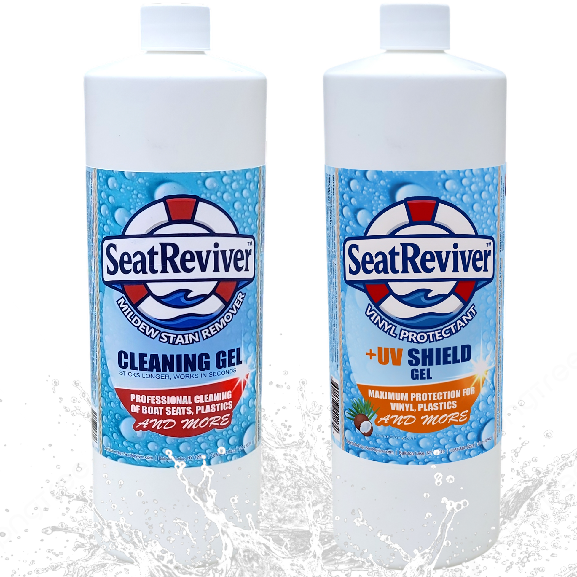 The Seat Reviver™ Boat Seat Restore & Protect Kit combines both of our premium products — the Mildew Stain Remover Cleaning Gel and the Vinyl Protectant + UV Shield Gel — for complete surface care that cleans deeper and protects longer.