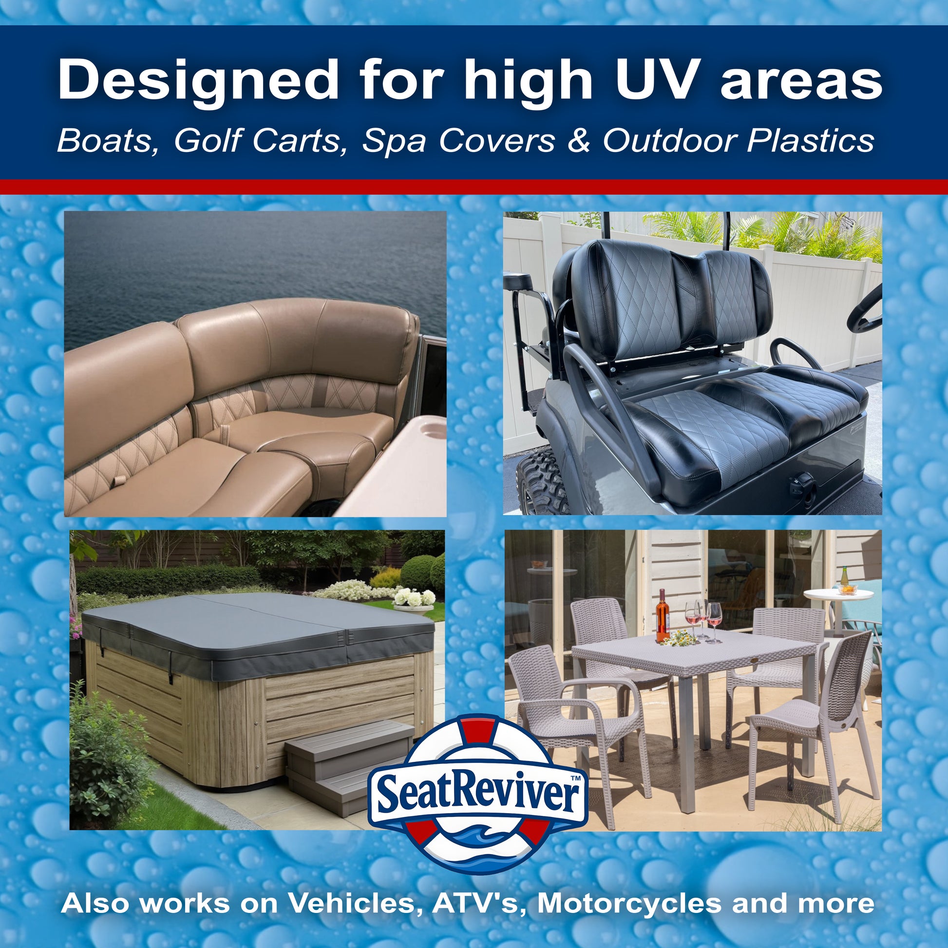 Boat seats, marine vinyl, plastics, rubber, spa covers, golf carts, and more.