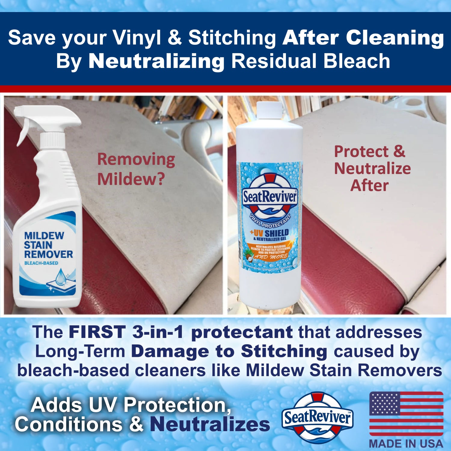 - Provides Max Protection for Seat Stitching when using after any Mildew Stain Remover by Neutralizing Residual Cleaner
